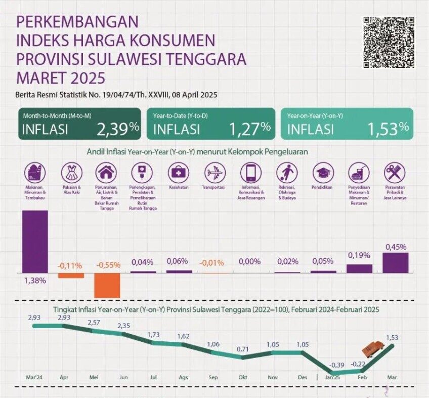Secara bulanan (month to month/m-to-m), Sultra mengalami inflasi sebesar 2,39 persen. Sementara inflasi sepanjang tahun berjalan hingga Maret 2025 (year to date/y-to-d) tercatat sebesar 1,27 persen.