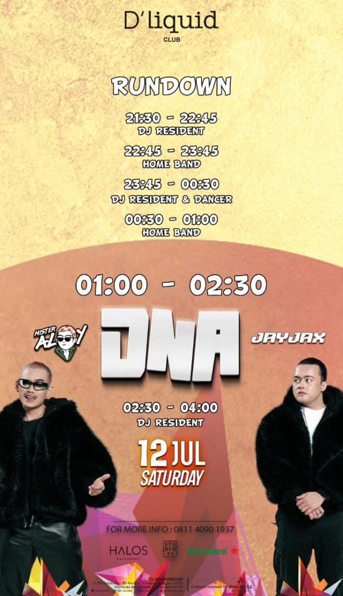 Rundown acara telah disusun dengan cermat untuk memastikan kemeriahan sepanjang malam. Pintu D’liquid Club akan dibuka mulai pukul 21:30 WITA, diawali dengan penampilan DJ Resident dan Home Band. Puncak acara, penampilan DNA bersama Mister Aloy dan Jayjax, dijadwalkan akan dimulai pukul 01:00 hingga 02:30 WITA, disusul oleh DJ Resident hingga pukul 04:00 WITA.