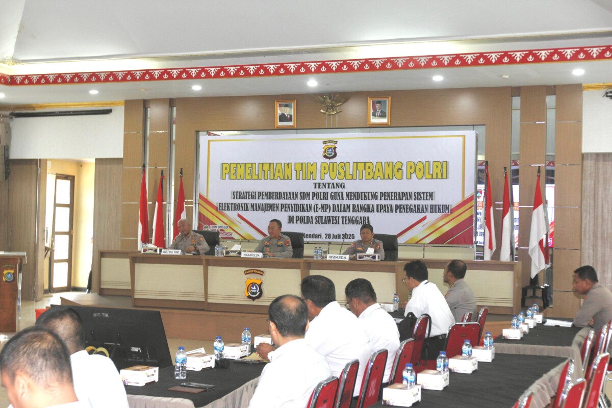 IndeksSultra.com, Kendari- Kepolisian Daerah Sulawesi Tenggara (Polda Sultra) menerima kunjungan dari Tim Pusat Penelitian dan Pengembangan (Puslitbang) Polri guna melaksanakan studi strategis terkait penguatan sumber daya manusia (SDM) dalam mendukung penerapan Sistem Elektronik Manajemen Penyidikan (Electronic Management of Investigation/E-MP).