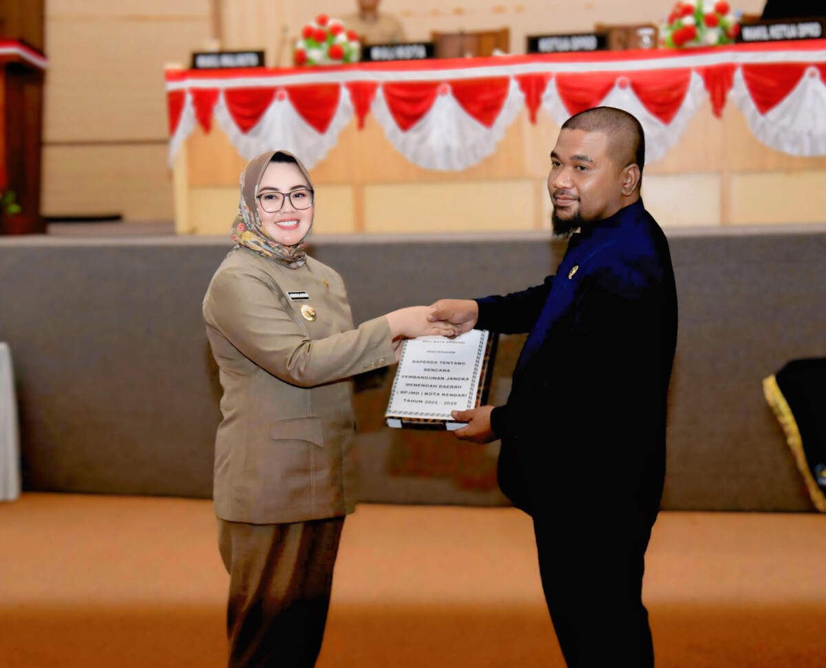 IndeksSultra.com, Kendari- Wali Kota Kendari, dr. Hj. Siska Karina Imran, secara resmi menyerahkan dokumen Rancangan Peraturan Daerah (Raperda) tentang Rencana Pembangunan Jangka Menengah Daerah (RPJMD) Kota Kendari tahun 2025–2029 dalam rapat paripurna DPRD Kota Kendari, Senin 14 Juli 2025.