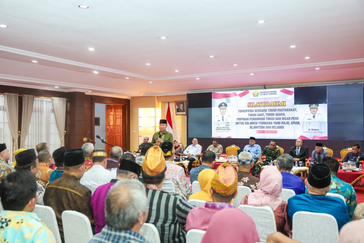 Hal ini disampaikan saat acara silaturahmi bersama Forkopimda, tokoh masyarakat, tokoh agama, akademisi, serta insan pers di Aula Merah Putih, Rumah Jabatan Gubernur Sultra, Kamis 4 September 2025.