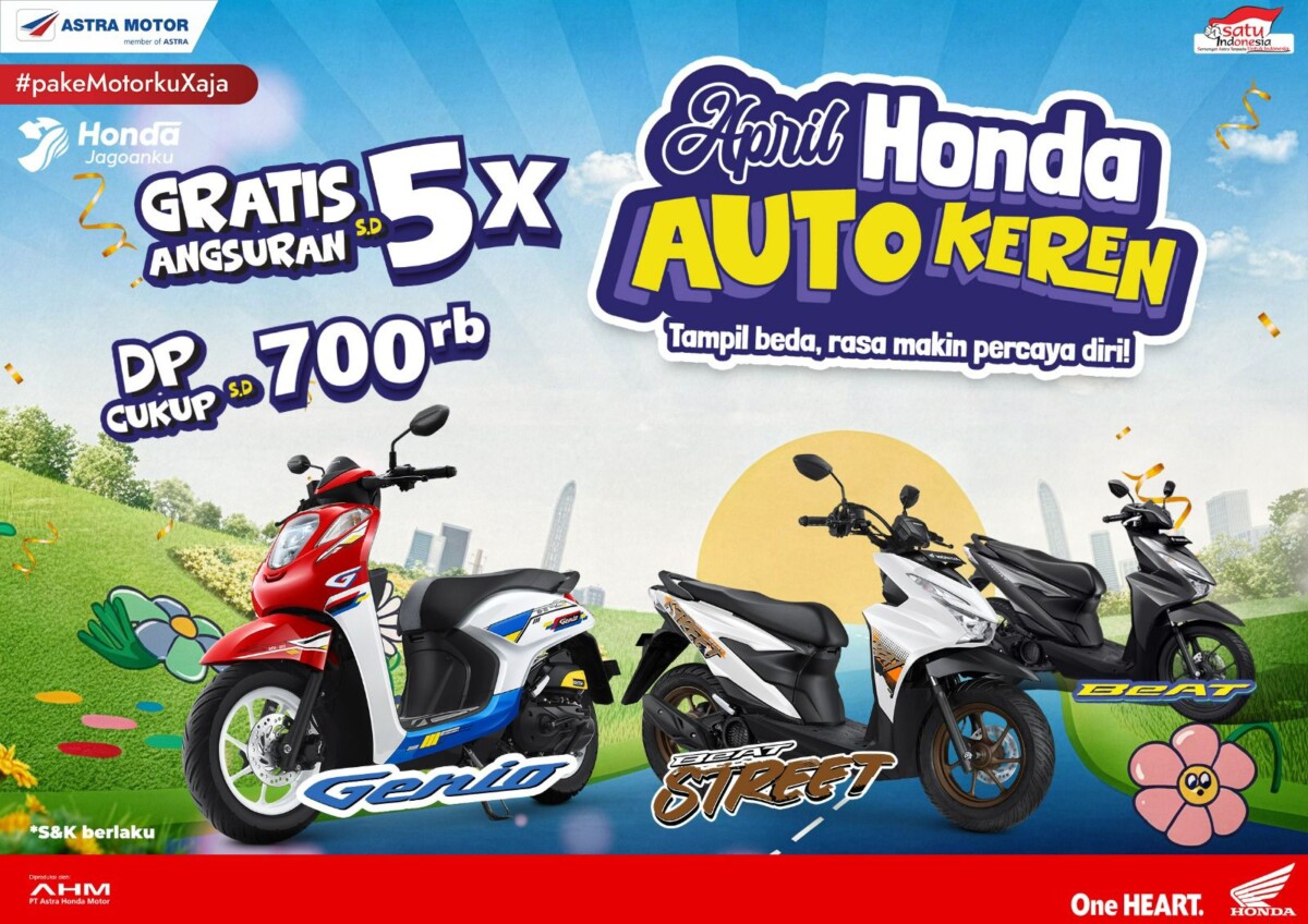 Dalam promo ini, konsumen bisa membawa pulang motor seperti Honda Genio, Honda Beat Street, dan Honda Beat dengan DP hanya Rp700 ribu. Selain itu, tersedia keuntungan tambahan berupa gratis angsuran hingga lima kali.