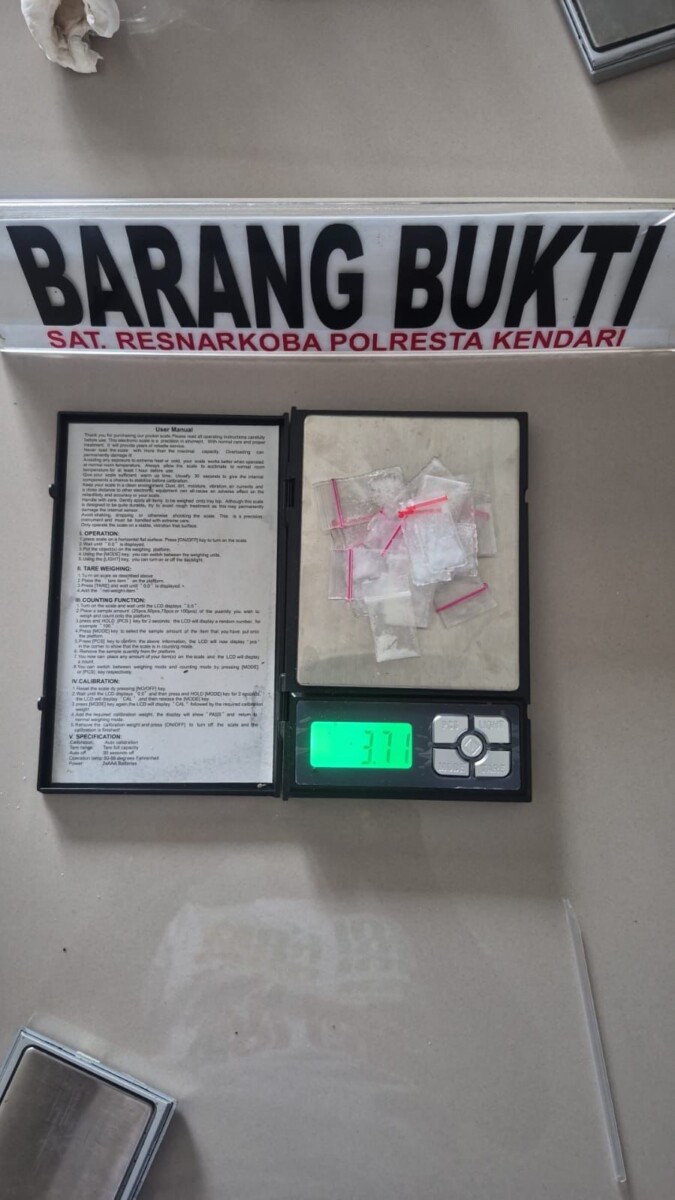Kasat Narkoba Polresta Kendari, AKP Andi Musakkir Musni, menjelaskan bahwa dari hasil penggerebekan, petugas menemukan sebanyak 21 sachet plastik bening berisi kristal yang diduga sabu dengan berat bruto sekitar 3,37 gram.